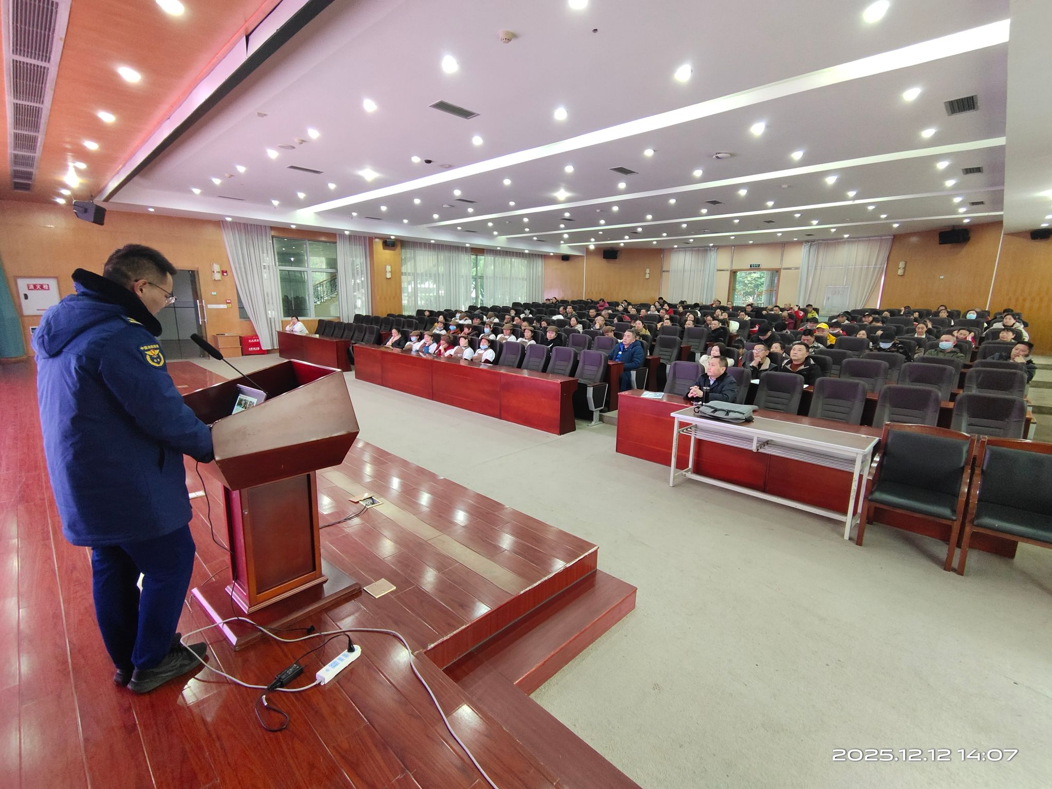 在四教A208室、十教学术报告厅,培训教官结合成都市、雅安市近期火灾案例及香港火灾等典型事件,系统讲解消防逃生技巧与器材使用方法。内容涵盖火灾隐患识别、报火警流程、初起火灾扑救原则等,帮助参训人员构建完整的消防安全知识体系。